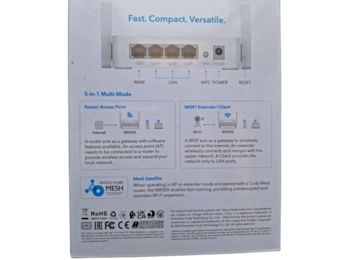 The Cudy WR300 N300 300Mbps WiFi Router, a comprehensive networking solution designed to provide reliable and high-speed internet connectivity for homes and small businesses. With Wi-Fi speeds of up to 300 Mbps, this router ensures fast and stable wireless connections, perfect for streaming, gaming, and browsing. Equipped with four 10/100 Mbps Ethernet ports, it easily accommodates wired devices such as desktop computers, smart TVs, and gaming consoles, ensuring uninterrupted internet access. The inclusion of WireGuard/L2TP/PPTP VPN Client functionality allows for secure access to private or commercial VPN networks, ensuring data privacy and protection. Additionally, the Cudy Mesh Satellite feature enables users to expand their Wi-Fi coverage and create a mesh network for enhanced connectivity throughout their space. With versatile operation modes including Router, AP, RE, WISP, and Mesh Satellite, this router caters to a variety of networking needs. Its intuitive setup wizard simplifies configuration, while features like Wi-Fi scheduling and domain blacklists provide parental control and enhance security. Plus, the router seamlessly connects up to 30 devices wirelessly, ensuring everyone enjoys high-speed Wi-Fi access. Whether for casual home use or small business networking requirements, the Cudy WR300 N300 WiFi Router offers the performance, versatility, and security features needed for a seamless online experience.